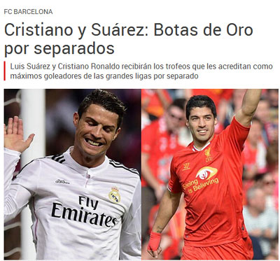 这是欧洲金靴历史上第3次并列金靴得主,前两次是1989-90赛季的乌戈-桑切斯和斯托伊奇科夫,2004-05赛季的弗兰&苏亚雷斯。虽然两人同时获得了欧洲金靴,但是来自《世界体育报》的消息称,两人不会同时出现在领奖台上,而是在各自的球队所在地接受颁奖,西班牙当地时间下周三,也就是10月15日,C罗将在马德里领奖,而苏亚雷斯则在巴塞罗那领取金靴奖。