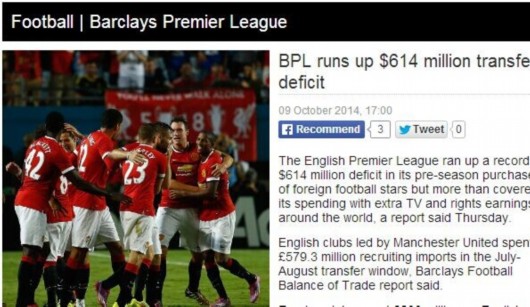 值得注意的是,在巴克莱银行的统计中,一向以转会生财为主的巴西联赛,本赛季的收益从去年的1亿6000万英镑锐减至1990万英镑;而西甲、法甲这样的欧洲顶级联赛,在夏季的转会中不仅没有出现赤字,反而都有5000万英镑左右的盈余,似乎能在一定程度上体现各国足球理念的不同。