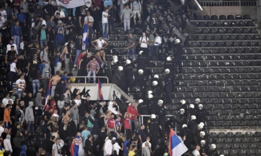 图片说明:塞尔维亚与阿尔巴尼亚的比赛因双方政治冲突以及客队球迷滋事,球员、球迷们都大打出手,防暴警察出动导致比赛被破中止。