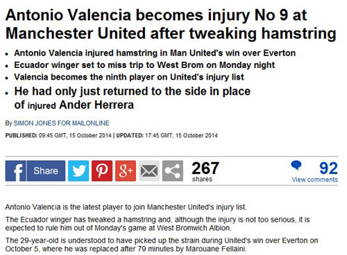 尽管过去两周是国际比赛日,但联赛间歇期对于曼联而言,似乎并没有大用处,伤兵仍旧满营,更令俱乐部崩溃的是,伤员非但没有减少,还多了一名球员!北京时间10月16日,《每日邮报》消息称,曼联主力边锋瓦伦西亚腿筋受伤,将无缘本周末战西布朗维奇的英超联赛。舰队街统计,算上瓦伦西亚,曼联一线队有多达9名球员受伤,其余8名球员分别是麦克奈尔(腿筋)、安德尔-赫雷拉(肋骨)、斯马林(大腿)、埃文斯(脚踝)、阿什利杨(腹股沟)、菲尔-琼斯(腿筋)、林加德(膝盖)和卡里克(脚踝)。