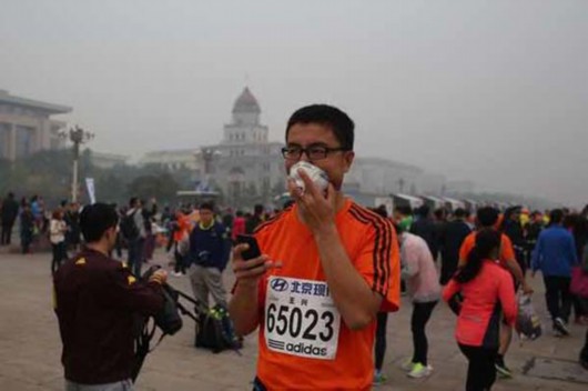 虽然正值雾霾天气,北京市空气重污染应急指挥部办公室也在昨天18时发布空气重污染蓝色预警,但依然挡不住民众对北马的热情,今天共有来自55个国家和地区的三万名选手参与比赛,为了最低限度的减少雾霾对自身身体的损害,不少人还是戴着各式各样的口罩、甚至很专业的防毒面具出场。面对镜头时,参与北马的民众纷纷做出胜利的手势,他们很享受这样的比赛氛围。