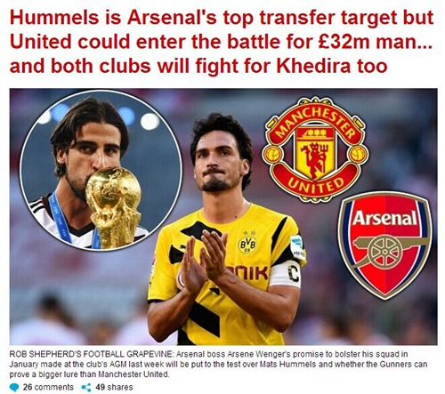 多特蒙德如此形势下,被舰队街认为是胡梅尔斯离队的大好时机,英国媒体《每日邮报》认为,无论是曼联还是阿森纳,想以2500万英镑的价格签下胡梅尔斯,有点不符合实际,如果两家球会真有诚意的话,报价3200万英镑会令多特蒙德放人。胡梅尔斯可以加强中后卫的位置,赫迪拉则能够加强中场防守,出道之初的他也能够担任攻击型中场,但后来在皇马转型为防守型中场,作为主力帮助西甲豪门夺得诸多荣誉,而且今夏与胡梅尔斯一起帮助德国在今夏巴西世界杯上捧起大力神杯,赫迪拉发挥非常出色。