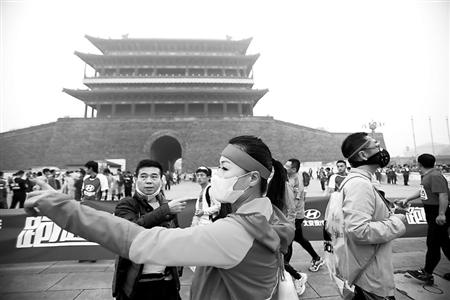 昨天上午,一年一度的北京马拉松赛在天安门广场鸣枪开跑。由于雾霾重重,跑友们的口罩成为比赛标准装备。原本一场快乐的国际比赛,因为空气重度污染,几乎变成了一场防毒大会。