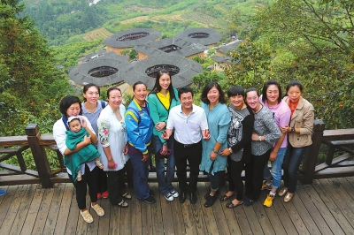 23日,中国女排原主教练陈忠和与中国女排雅典奥运冠军队一起走进南靖土楼。女排姑娘们在田螺坑景区合影留念,功勋教练陈忠和更是比起剪刀手显示自己的好情。