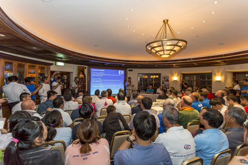 图片说明:本届中国杯帆船赛赛事总监周亮、仲裁主席Rut Subniran、裁判长Simon James向与会船长介绍比赛规则及相关海域、天气、水文情况,并向参赛船队送上美好祝愿。