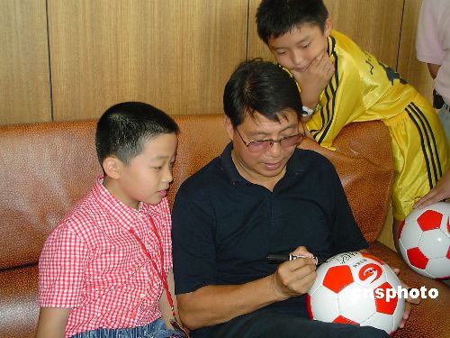 资料图:徐根宝在上海崇明岛足球基地为小球迷签名留念。