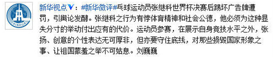 新华社新华视点微博对张继科事件发表评论:“乓球运动员张继科世界杯决赛后踢坏广告牌遭罚,引舆论发酵。张继科之行为有悖体育精神和社会公德,他必须为这种显失分寸的举动付出应有的代价。运动员参赛,在展示自身竞技水平之外,张扬、创意的个性表达无可厚非,但亦要守住底线,对那些损毁国家形象之事、让祖国蒙羞之举不可姑息。”