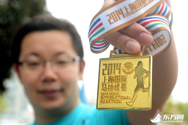 图片说明:选手展示2014上海马拉松奖牌