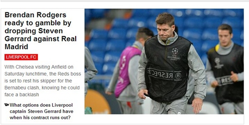 关于杰拉德不能首发出场的传闻,而且获得了主帅罗杰斯的确认,北爱尔兰人称,未来一周利物浦要连战皇马和切尔西,就欧冠和英超两项赛事的形势,他会优先考虑本周末利物浦在安菲尔德球场战切尔西的英超联赛。“不派杰拉德出战皇马,我不认为是一种赌博,因为这一周像对阵皇马这样的大比赛有不少,你需要为球队阵容考虑一下,哪些球员会出场,哪些球员会留到周末出场,当然我信任我的每一名球员。关于杰拉德的情况,如果他踢本周六的英超联赛,我必须为他和我们自己考虑一下。”