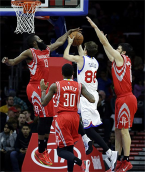 火箭胜76人哈登篮下送大帽
