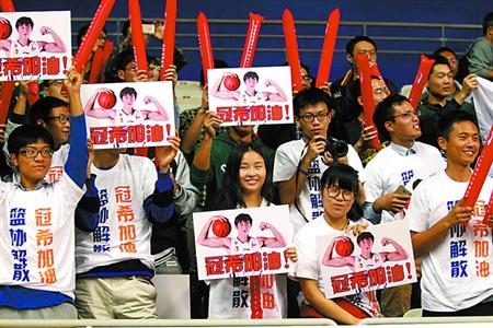 不过相比第一场,昨天上海男篮的抗议显得含蓄很多:球员鞋子袜子上印有“兄弟冠希”字样的胶布没有了。仅在中场时,主场大屏幕上放起了赛前拍摄的吴冠希职业生涯纪录短片。倒是现场不少球迷表现得更激烈些,赛前高喊“吴冠希”,在看台上高举“冠希加油”的牌子。