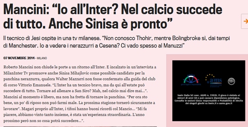 现年49岁的曼奇尼2004年离开拉齐奥后,拿起国际米拉的教鞭,在梅阿查他共执教五年,带领蓝黑军团夺得3个意甲冠军、2个意大利杯冠军和2个意大利超级杯冠军;2009年离开国际米兰后,曼奇尼来到英超球会曼城执教,与在国际米兰时期的遭遇一样,内战内行、外战外行,欧战成绩太差再度被炒鱿鱼。此前,曼奇尼在土耳其执教,是加拉塔萨雷的主教练,由于多重原因再度被炒鱿鱼,目前赋闲在家。