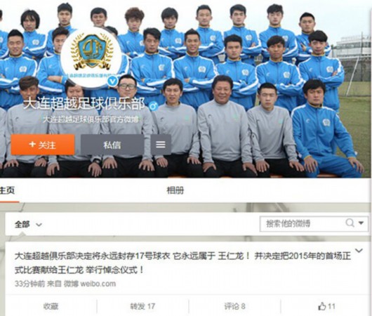 今天,大连超越官方宣布:“俱乐部决定将永远封存17号球衣,它永远属于王仁龙! 并决定把2015年的首场正式比赛献给王仁龙举行悼念仪式”!