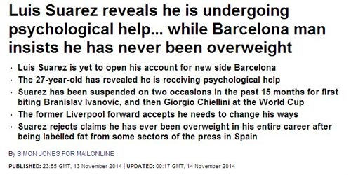 曾经有消息称,在世界杯后,苏亚雷斯的体重超标,对此苏神回应道,“我从来没有超重过,只有恩里克一次讲过什么时候看到过苏亚雷斯瘦过。他还表示如果需要,我可以吸脂。而且球队的队医曾经告诉我,我是球队体脂比最低的六个人之一。那些新闻只不过是为了吸引人们的眼球罢了,都是新闻竞争中的手段,有时候队友也跟我开玩笑,告诉我不能再多吃了,这对我没什么影响。”