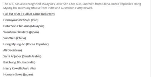 今年是亚足联成立60周年,为纪念这一特殊的年份,亚足联在其官网从各种角度对亚洲足球进行了回顾、总结和奖励。此次评选出首批进入亚洲足球名人堂的十位球星,目的就在于让大家再次记起那些曾经创造过无数辉煌的亚洲足球巨星,这其中就包括昔日中国女足国脚孙雯,另外被称为头家的前马来西亚足球名宿苏进安也是出生于马来西亚华裔。