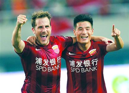 图片说明:上港集团队锋线双子星海森(左)和武磊