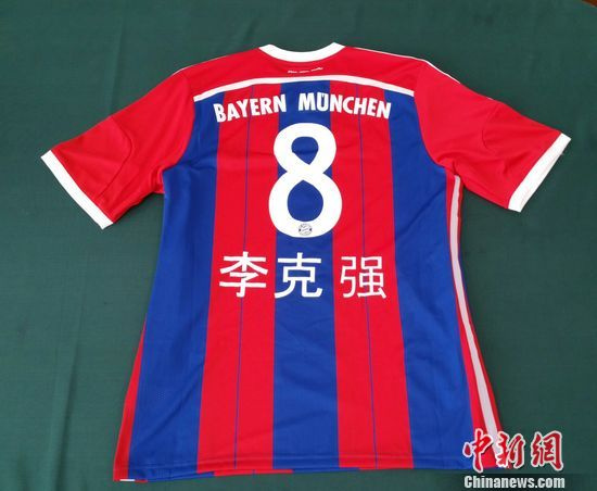 昨日,德国巴伐利亚州州长泽霍夫向李克强赠送了印有李克强名字、并由全体球员签名的拜仁慕尼黑队8号球衣。