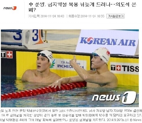 北京时间11月24日,国内媒体曝出孙杨在5月17日的一次尿检中,被查出使用了违禁物质,并从当日至8月16日被禁赛了三个月。随后,孙杨参加了亚运会。消息一出,媒体一片哗然,而韩国媒体也对此给予了高度关注,韩媒《NEWS1》质疑为何要故意隐瞒孙杨丑闻,并对孙杨的亚运会参赛资格提出异议。而很多韩国网友则对孙杨感到失望,因为中国明星也是韩国偶像朴泰桓的好朋友。