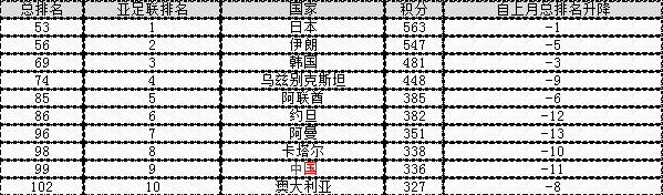 在总榜单上,国足排名一下子跌了11位,跌落至第99名,这是国足近14个月来的第二差排名,仅比2014年6 月时的第103名略好。不过在亚足联榜单上依然排名第9,与上月相比没有变化。12月13日和17日将在湖南郴州连续与中国国家队进行两场热身赛的吉尔吉斯斯坦队最新排位为153名。韩国队国际足联排名难以止跌,在降至第69位后刷新了上个月时位列66名的历史新低。澳大利亚队同样如此,在上月创下历史最低的94位后,本月更是破百已经跌到了第102位再刷底线。