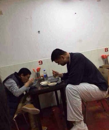 原标题: 网友偶遇姚明偷拍巨人吃面:他所坐的凳子好憋屈