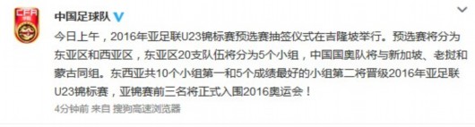 中国足球队官方微博发布消息,2016年亚足联U23锦标赛预选赛抽签仪式在吉隆坡举行。中国国奥队将与新加坡、老挝和蒙古同组。