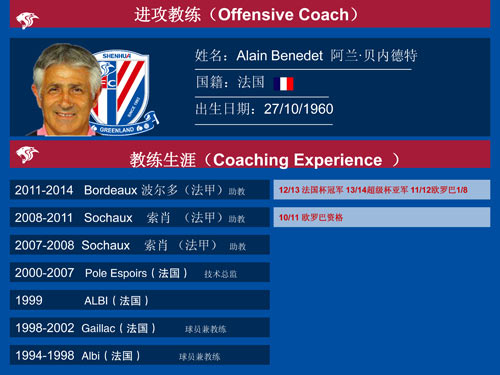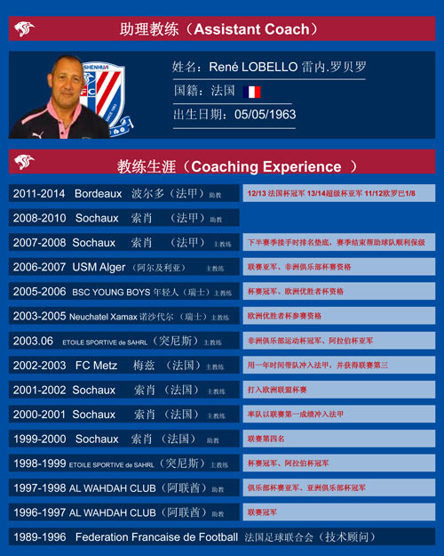 第一助教雷内·罗贝罗拥有法国和国际高等足球学院教练及讲师资格,有着非常丰富的现代足球理念,在法国多次将乙级队带入甲级;在非洲也取得过俱乐部杯冠军,同时率队获得过亚洲俱乐部冠军杯,有着丰富的海外执教的经验和能力,深受法国足球界的爱戴和推崇,是法国近年来涌现的优秀教练生力军之一。