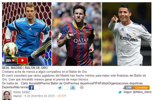 原标题: C罗不满皇马队友无缘金球前3 梅西诺伊尔谁下?