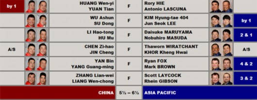 在最后两场比赛中,中国队的严斌和杨光明组合以输4洞剩2洞不敌对手。老将张连伟和梁文冲搭档,不过也以输3洞剩2洞被亚太队的斯科特-莱考克以及里恩-吉布森组合击败。