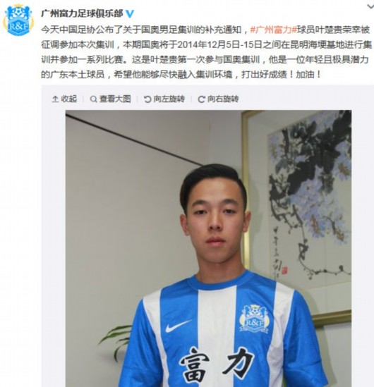今天中国足协公布了关于国奥男足集训的补充通知,广州富力球员叶楚贵荣幸被征调参加本次集训,本期国奥将于2014年12月5日-15日之间在昆明海埂基地进行集训并参加一系列比赛。这是叶楚贵第一次参与国奥集训,他是一位年轻且极具潜力的广东本土球员,希望他能够尽快融入集训环境,打出好成绩!加油!