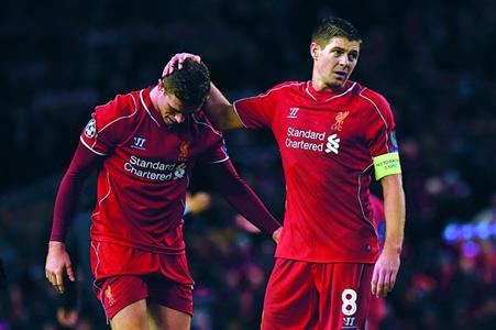 □利物浦队球员杰拉德(右)赛后安慰队友亨德森/新华社