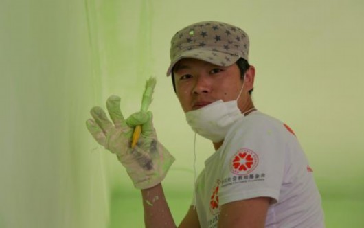 图片说明:方勇生前的照片,大理梨园小学捐助图书馆时他在粉刷墙壁。