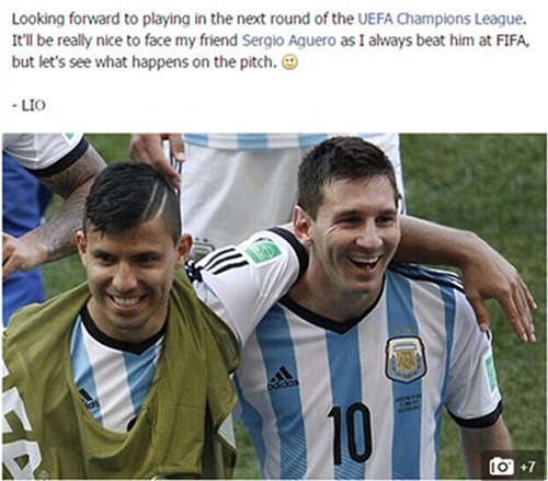 在欧冠抽签仪式结束之后,梅西在Facebook上发了这样一段话:“非常期待欧冠下一轮的比赛!面对我的朋友阿圭罗让我很开心。我总在FIFA游戏中赢他。球场上?拭目以待吧!”