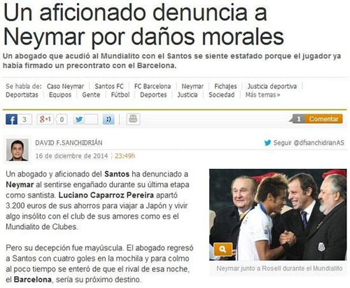 内马尔自从加盟巴萨以后一直麻烦事不断,上赛季始终没有发挥出最大能量被媒体和球迷广泛质疑,此外还因为转会费问题官司缠身。本赛季内马尔的发挥好于上赛季,但是自己和布鲁娜分手的事件被炒得沸沸扬扬,在12月初,巴西新皇又不幸受伤。而《阿斯报》则透露,内马尔又吃官司了,原告则是老东家桑托斯俱乐部的律师。