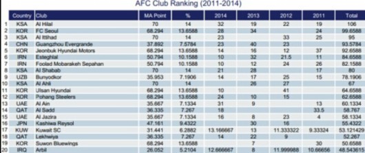 本次亚洲俱乐部排名统计起止年份为2011年-2014年,一共有来自亚足联成员国的147家足球俱乐部上榜。排名第一的是本赛季的亚冠亚军,沙特豪门阿尔希拉尔,他们近4年的总得分是106分。韩国劲旅FC首尔以99.6588分排名第2位,沙特豪门伊蒂哈德以95分排名第3位。