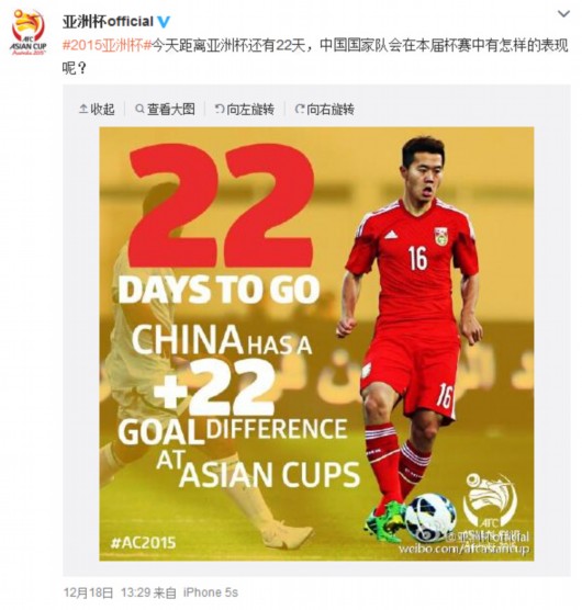 北京时间12月18日,距离国足出征亚洲杯的日子越来越近,亚洲杯的官方微博@亚洲杯official今天也将中国队作为话题:“#2015亚洲杯#今天距离亚洲杯还有22天,中国国家队会在本届杯赛中有怎样的表现呢?”,不过微博的主题图片竟是基本确定无缘亚洲杯的黄博文,引网友热议。