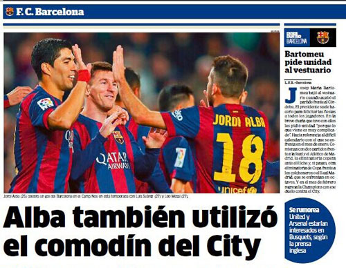 巴萨的2014年结束了,但巴萨的麻烦并没有结束,维尔马伦重伤,国际足联驳回了巴萨申请的引援绿卡,蒙托亚已经提交了转会申请,梅西身陷转会传闻,布斯克茨成为英超三强竞争的对象,本周一出版的《马卡报》则又爆出了一则惊人消息,就在10月份,阿尔巴的经纪人曾主动联系上了曼城,询问英超豪门是否有购入阿尔巴的意愿。