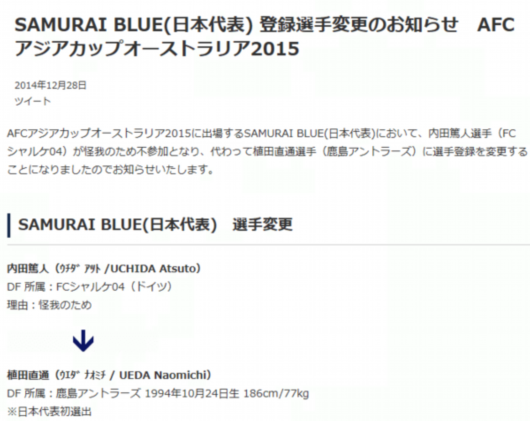 北京时间12月28日,日本足协宣布日本队亚洲杯名单变更,效力于鹿岛鹿角队的小将植田直通,替代膝伤在身的沙尔克04队内田笃人出战。日本队在右边后卫的位置上,失去了攻守兼备的内田笃人,对球队的卫冕前景亦是一个颇为沉重的打击。