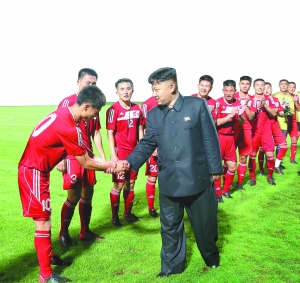 对于外界疯传的输球就要挖煤,朝鲜足协副秘书长进行了否认。图为朝鲜最高领导人金正恩正接见朝鲜国家队。