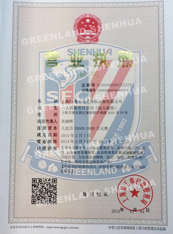 东方网消息:昨天晚上,申花官方微博宣布,申花工商更名手续已经全部完成。微博中写到:2015年的第一个工作日,终于拿到了新的营业执照,工商更名手续已经全部完成。即日起,原上海绿地足球俱乐部正式更名为上海绿地申花足球俱乐部。