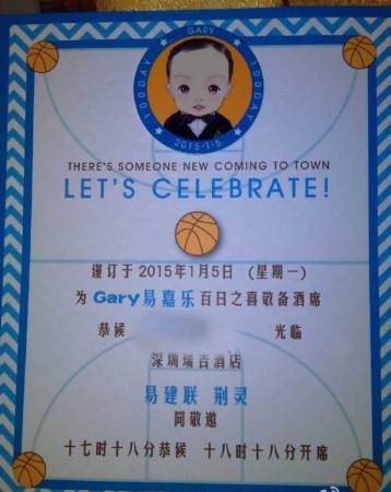 在百天宴现场摆满了易嘉乐的萌照。其中,有阿联给孩子喂奶的照片,也有孩子自己卖萌的照片。值得一提的是,孩子的名字也在百天宴的请柬中曝光,孩子名叫 易嘉乐,英文名为GARY。有到场嘉宾盛赞这个名字取得好,有意义。因为易建联的父亲叫易景流,所以这祖孙三人的名字缩写均为YJL,不知道易家为孩子取 这个名字是凑效还是有意为之。
