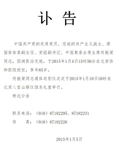 北京时间1月5日消息,昨日下午15:50分,中国奥委会名誉主席,国际奥委会委员何振梁先生因病去世,享年86岁。作为中国奥林匹克运动的巨大贡献者,中国首次申奥成功的决定性人物。中国共产党的优秀党员、忠诚的共产主义战士、原国家体委副主任、党组副书记、中国奥委会原主席何振梁同志,因病医治无效,于2015年1月4日15时50分在北京协和医院逝世,享年85岁。