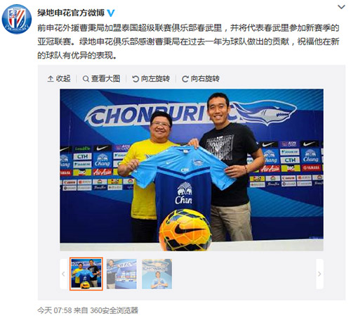 原标题: 上海申花官方宣布曹秉局离队 加盟泰超春武里队