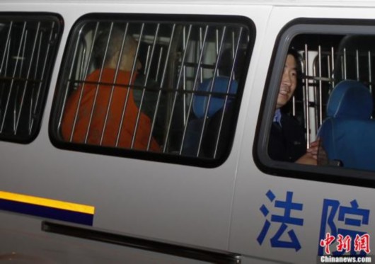 图片说明:2012年4月24日上午9时,足坛反赌扫黑系列案终结庭审在辽宁省丹东市中级人民法院拉开帷幕。图为当晚21:30分左右,谢亚龙被押出法院。(资料图)