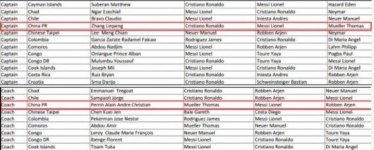 中国国家队队长张琳芃的选票依次为C罗,梅西,托马斯-穆勒。而中国国家队主帅佩兰的选票依次为托马斯-穆勒,梅西,罗本。显然,国足将帅间出现了分歧,张琳芃大爱的C罗,在佩兰面前得不到青睐。