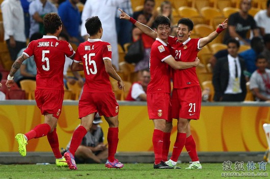 主教练佩兰率领国足的首场正式比赛以1-0小胜此前18年5战未有一胜的沙特阿拉伯队,在最近三届亚洲杯决赛圈首战中都取得开门红,不过2007年和2011年两届亚洲杯国足都是虎头蛇尾最终未能小组出线。第61分钟,哈扎兹单刀带球突破入禁区内,任航鲁莽做出滑铲动作将其铲倒,伊朗籍主裁法加尼黄牌警告任航,并判罚给沙特队点球,哈扎兹亲自操刀主罚,结果踢出的点球被王大雷用腿挡出。第81分钟,于海主罚前场右肋30米外任意球选择直接打门,皮球打在纳瓦夫身体后变线飞入沙特队球门左下死角,国足借此1-0击败沙特队。
