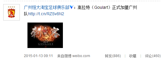 广州恒大在官方网站上介绍说:“2015年1月13日上午(巴西当地时间1月12日晚),广州恒大淘宝足球俱乐部官方宣布与巴甲卫冕冠军克鲁塞罗队主力双子星、现役巴西国脚里卡多·高拉特·佩雷拉(全名Ricardo Goulart Pereira)正式签约,转会费为1500万欧元,签约四年。该球员在体检合格后于1月20日左右直接飞赴西班牙同球队汇合冬训,将身披11号战袍,待球队返回广州后俱乐部将召开新援见面会。”