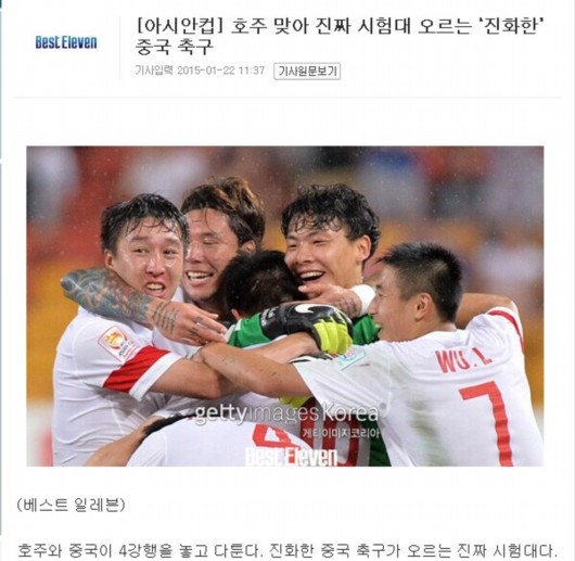 韩国《NAVER》网站22日刊登文章指出,2015年澳大利亚亚洲杯上,中国队将与东道主澳大利亚队展开一场四分之一决赛的争夺,对于成长之中的中国队来说,这场比赛无疑是检验其成色的最好试金石。
