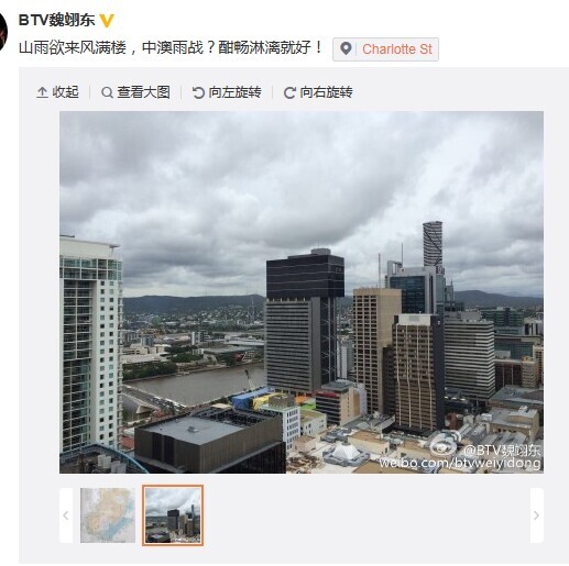 在黄健翔的微博中,他如此写到:“今晚八成是一场雨战!有趣!刺激!”,并配了一张布里斯班今天天气预报的配图。从这张配图我们可以看到,其中澳大利亚当地7点下雨的可能性为90%,温度为23度;下午8点下雨的可能性为100%,温度为23度,而这正是今晚国足和澳大利亚队的比赛开打前半个小时;而下午9点下雨的可能性为90%,温度为23度。除了黄健翔,著名体育解说员评论员魏翊东也在自己的微博中对布里斯班的天气进行了介绍,他写到:“山雨欲来风满楼,中澳雨战?酣畅淋漓就好!”由此看来,今晚这场比赛将会是一场雨战。