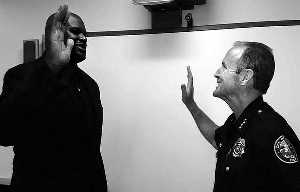 在多拉尔市警察局长唐纳德·德卢卡(右)的主持下,奥尼尔(左)正式宣誓加入警队,成为一名预备警官。