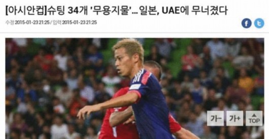 韩国媒体《首尔体育》刊文称,日本狂攻无果,倒在阿联酋脚下。该媒体称,日本队斜传球54个,角球18个,完全领先于阿联酋,但是形成鲜明对比的是进球只有一个,最终反而败北。阿吉雷主教练带领的日本队在23日(韩国时间)于澳大利亚悉尼进行的8强淘汰赛中,经过120分钟的比赛,最终与阿联酋打成1:1平进入点球大战,最终4-5败北。日本队自1996年阿联酋亚洲杯后,取得历史最差战绩。而四强的对阵也敲定为韩国对阵伊拉克、澳大利亚对阵阿联酋。